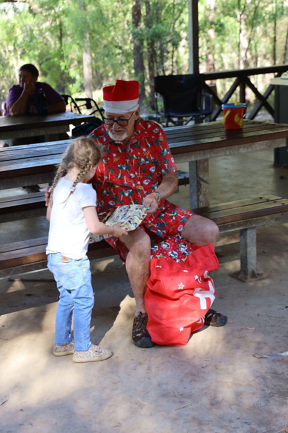 As the afternoon wore on people began congregating at the BBQ/Shade centre, and shortly a very busy Santa sent along his “assistant”, in appropriate dress, to distribute gifts to all the happy kids waiting in anticipation.